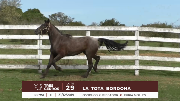 Lobuna mora que fuera la última cría de una yegua que tan bien nos produjo y fuera hermana entera de Ojo al Cristo, padrillo con la mejor demostración funcional hasta el momento y padre entre otros de Canuto Molles, el caballo que ganó todo en Uruguay y tan bien nos representó en el exterior. Por padre, un padrillo con un pedigree "soñado"